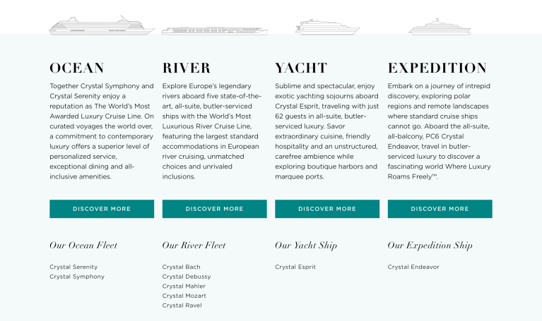 I wish to provide my clients with the best! In my opinion after having studied the curriculum and graduated as a Crystal Cruises Specialist, in the World of Cruises there’s only one name to consider “Crystal.” It was only a couple of years ago that I had first heard the name; I was speaking with a regular visitor and client of the Lantzville Art Gallery which I was running in a small seaside village on Vancouver Island, Canada at the time. This lovely lady, who lived locally and waterfront; explained to me the differences in brief of the cruises she has been on. Crystal Cruises she said was by far the superior cruise company and the only one she and her friend will travel with. This conversation came to mind when making decisions on what I wish to specialize in for my clients now that I am a Travel Agent. Do you have a voyage in mind, below you can reference the Fleet Types to get a better idea of what would satisfy your desired cruising appetite. Or you can click on the image to be directed to the Crystal Cruises Website for more information. Do not hesitate to contact me for any questions, I would be honored to present you with a quote and to book your next voyage.